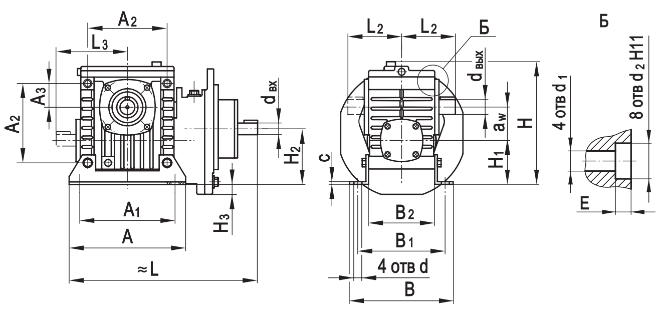 Типоразмер аw A A1 A2 A3 B B1 B2 L* L2* L3* H H1 H2 H3 c d d1 d2 E dвх dвых